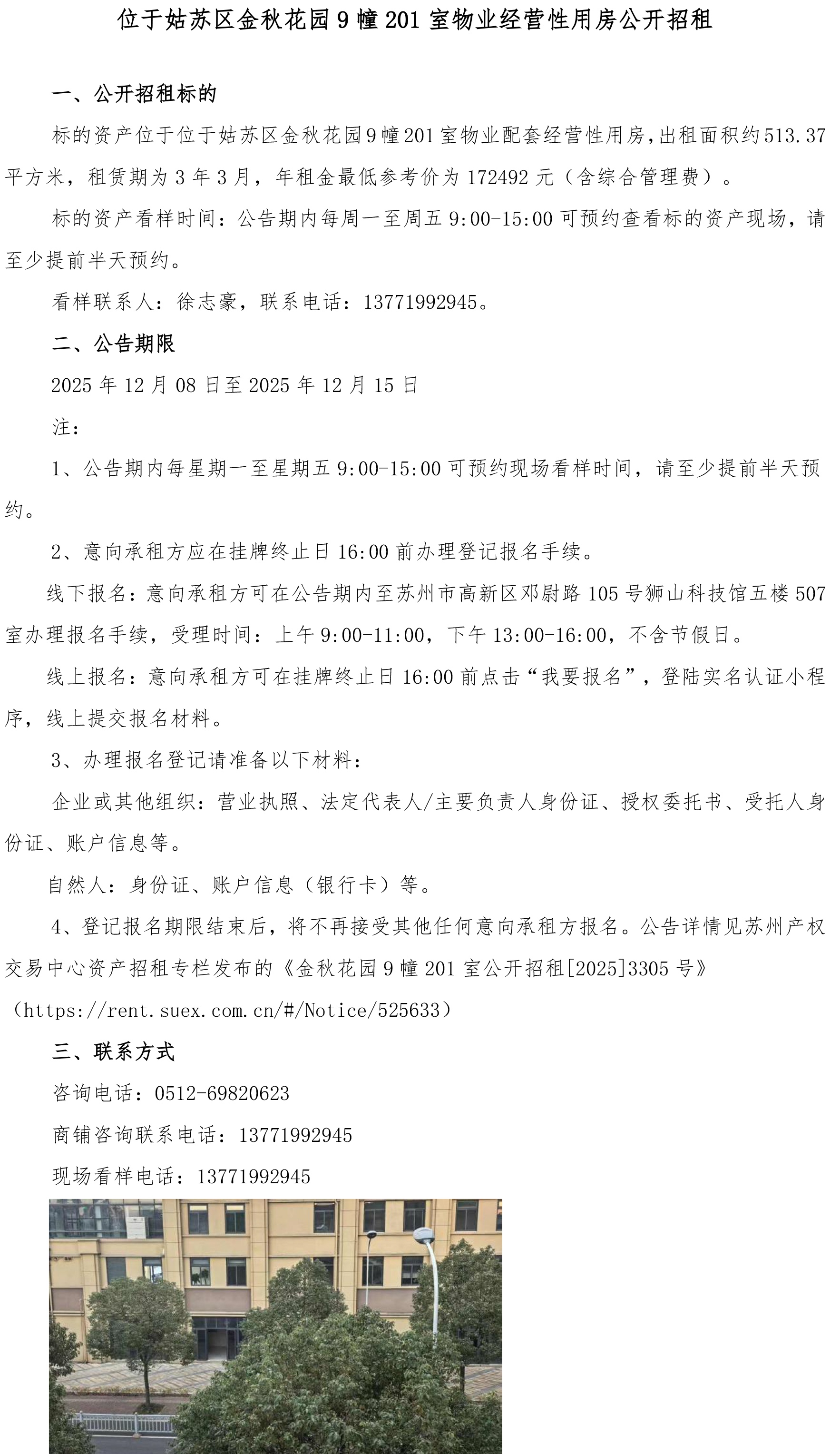 位于姑蘇區(qū)金秋花園9幢201室物業(yè)經(jīng)營性用房公開招租